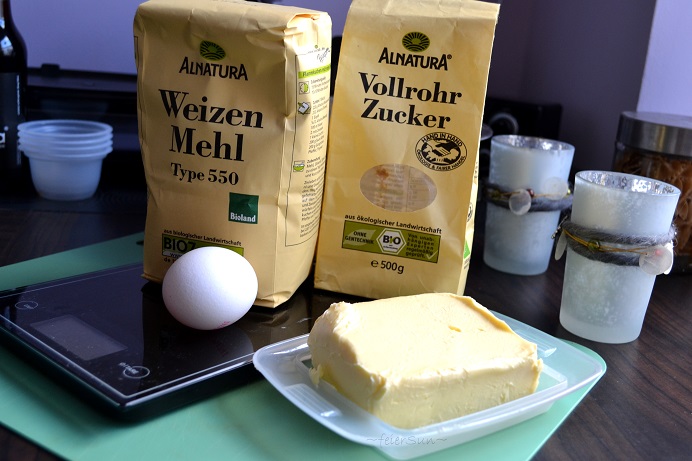 Ihr braucht kaum mehr als auf dem Bild zu sehen ist: 300g Mehl, 100g Zucker. 200g Butter und ein Ei. Dazu noch einen Schuss Milch und 1 TL Backpulver.