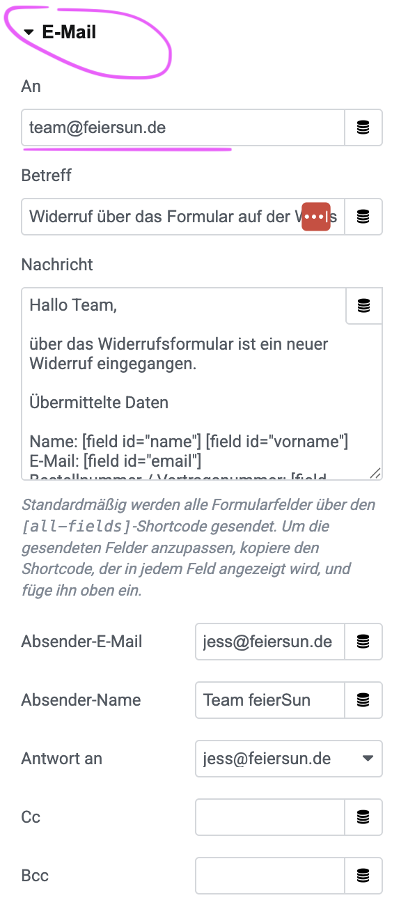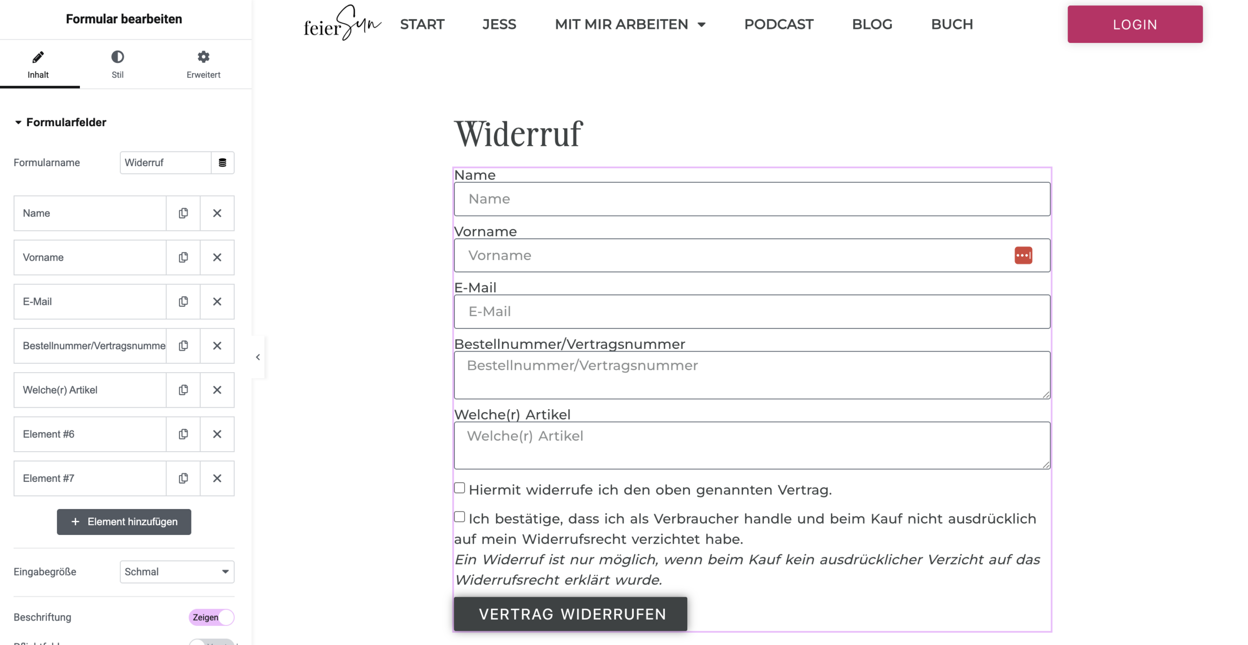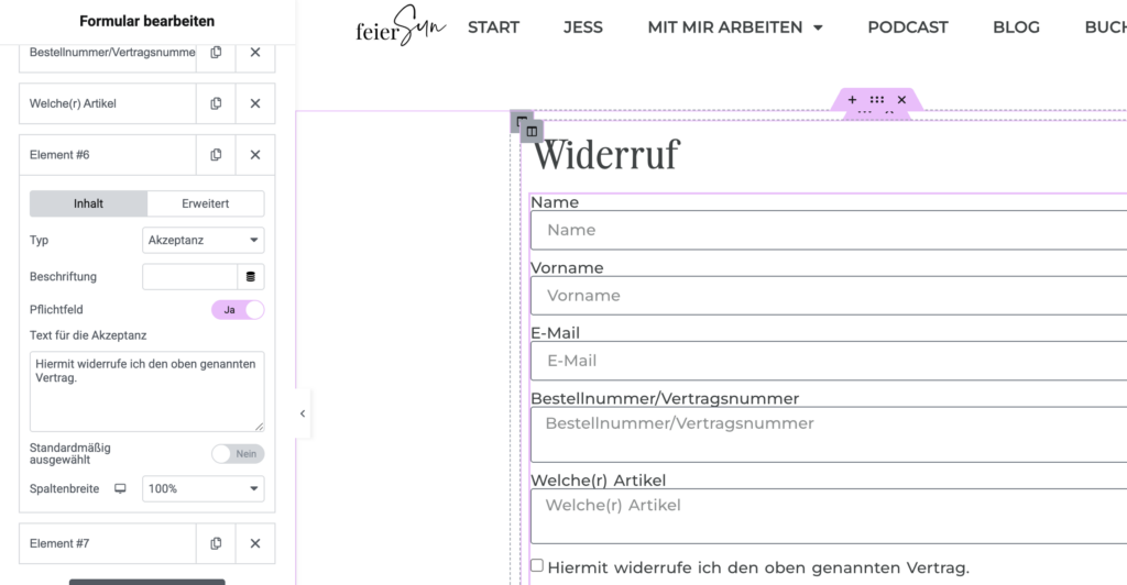 Die einfachste Lösung: eine eigene Seite mit einem Widerrufsformular und ein klar sichtbarer, hervorgehobener Link im Footer. Dahinter liegt ein Formular mit zwei Schritten: Daten eingeben, dann auf „Vertrag widerrufen“ klicken. Nach dem Absenden bekommt deine Kundin automatisch eine Bestätigungsmail.