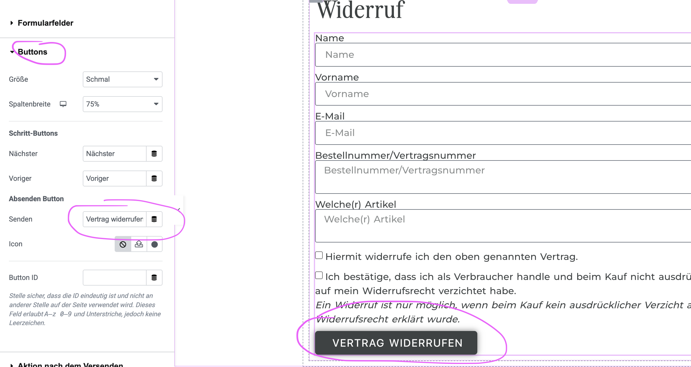 Was zählt: Deine Kundin muss sofort verstehen, wo sie den Widerruf starten kann. Die empfohlene Beschriftung lautet „Vertrag widerrufen“, genau so steht es im Gesetz. Begriffe wie „Stornieren“, „Anfrage stellen“ oder „Kontakt aufnehmen“ sind nicht zulässig, weil sie zu vage sind.